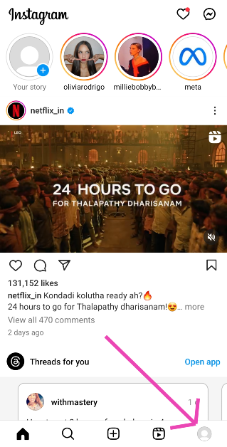 Vaihe 1: KäynnistääseInstagram -sovelluspuhelimessa ja napautaprofiilikuvaKuvake näytön oikeassa alakulmassa.