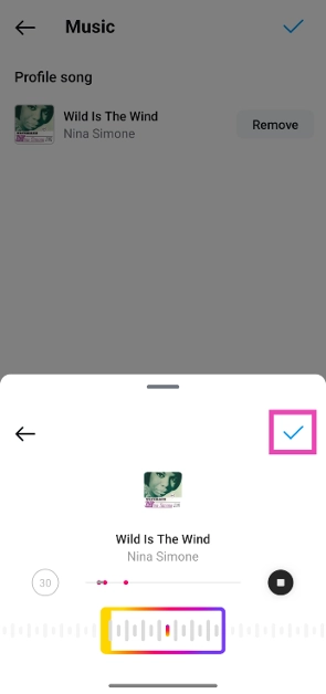 Vaihe 12:Napauttaasininen punkkiKuvake näytön oikeassa yläkulmassa lisätäksesi kappaleen profiiliin.