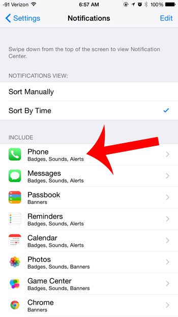 IPhonen puhelinilmoitusasetukset ovat näkyvissä vain, jos olet päättänyt sallia ilmoituksia. Jos et näe puhelinilmoituksesi asetuksia, sinun on todennäköisesti napauta vieressä olevaa painiketta, jotta ilmoitukset voivat mukauttaa vaihtoehtoja.