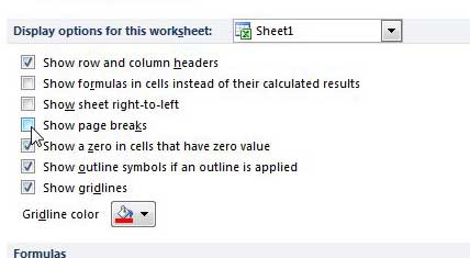 Vaihe 5: Vieritä kohtaanTämän laskentataulukon näyttöasetukset-osio ja valitse sitten ruudun vasemmalla puolella oleva valintaruutuNäytä sivunvaihdot. Huomaa, että tämä muuttaa vain tällä hetkellä aktiivisen laskentataulukon asetusta. Jos haluat tehdä tämän muutoksen muille laskentataulukoille, sinun on luotava kyseinen taulukko nykyiseen työkirjaan ja valittava sitten taulukko avattavasta valikostaTämän laskentataulukon näyttöasetukset.