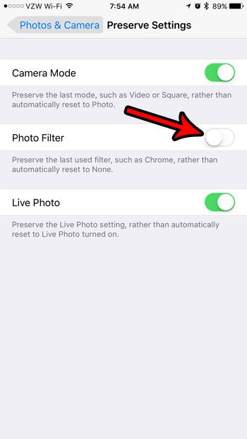 Vaihe 4: Napauta painiketta oikealla puolellaValokuvasuodatinSammuttaa se.