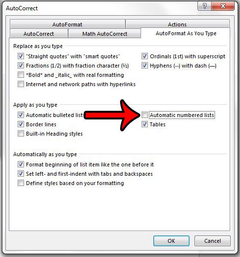 Vaihe 7: Napsauta vasemmalla puolella olevaa ruutuaAutomaattiset numeroituja luetteloitaValintamerkin poistaminen. Voit sitten napsauttaaHyväPainike ikkunan alareunassa tallentaaksesi ja käyttääksesi muutoksia ja napsauta sittenHyväPainike alareunassaWord -asetuksetIkkuna sulje myös ikkuna.
