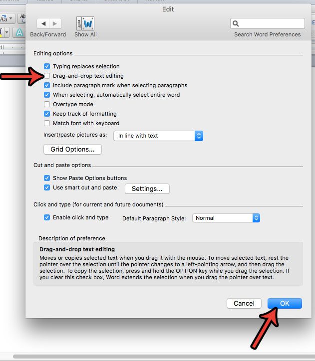 Vaihe 4: Napsauta ruutua vasemmalla puolellaVedä ja pudota tekstin muokkausValintamerkin poistaminen. NapsauttaaHyväPainike valikon alareunassa tallentaaksesi ja käyttääksesi muutoksia.