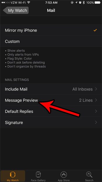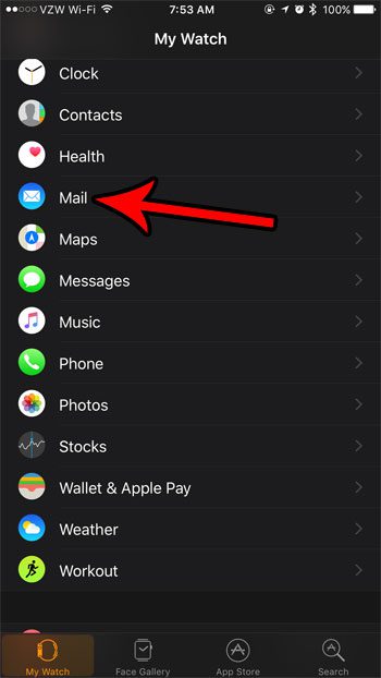 Yllä olevat vaiheet ovat osoittaneet sinulle, kuinka muuttaa Apple Watch -sovelluksen asetusta, joka määrittää, kuinka suuri osa sähköpostiviesteistäsi ilmestyy kelloseesi.