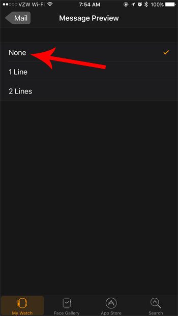 Jos et halua poistaa Apple Watch -sovelluksen postimerkkien viestinnän esikatselun käytöstä, voit kokeilla yhden rivin vaihtoehtoa nähdäksesi, toimiiko se. Voit aina vaihtaa tämän asetuksen myöhemmin, jos muutat mieltäsi siitä, kuinka suuri osa sähköposteistasi haluat näyttää kellopinnälläsi.