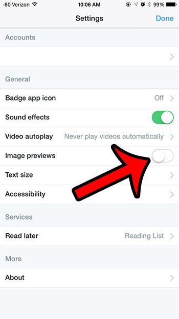 Onneksi tämä on säädettävä asetus iPhone -Twitter -sovelluksessa. Alla oleva opetusohjelma näyttää, kuinka kuvan esikatselut sammutavat.