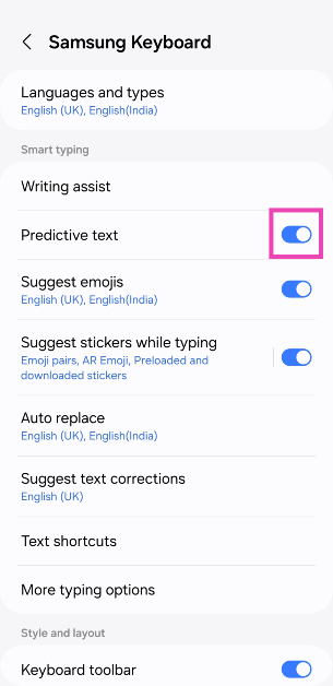 Ennustavan tekstinkäytön poistaminen käytöstä Samsung-näppäimistössä (Android)