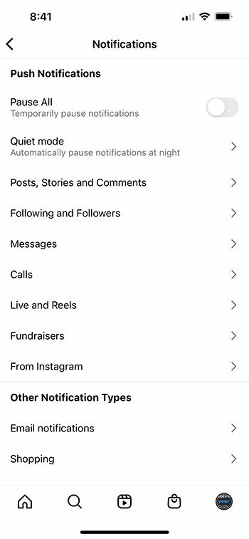 Yllä olevat vaiheet keskustelivat siitä, kuinka nämä asetukset voidaan muuttaa iPhone -valikoista, mutta Instagram -sovelluksen sisällä on myös joitain ilmoitusasetuksia.