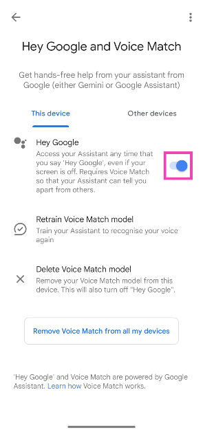 Mennä jhkGoogle> Asetukset> Google Assistant> Hey Google & Voice Matchja sammuta kytkinkytkin 'Hey Google' vieressä.