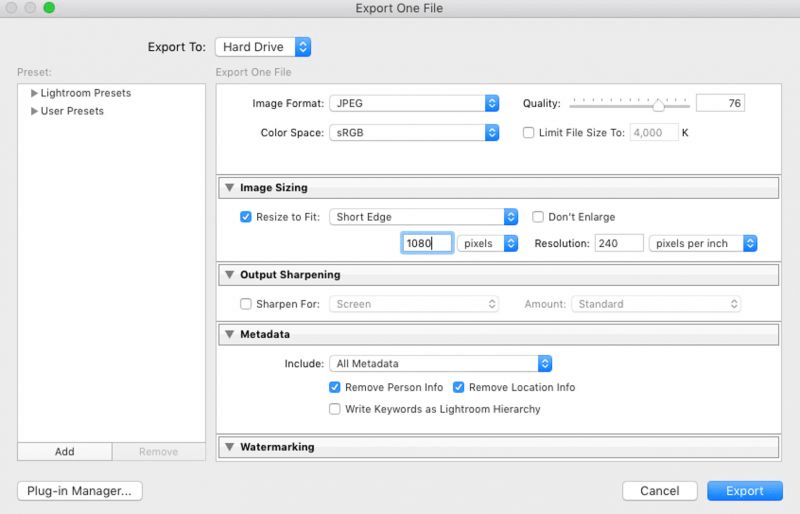 Jos käytät Lightroomia, voit määrittää mukautetun vientiasetuksen, joka varmistaa, että valokuvasi eivät koskaan ylitä 1080 px.