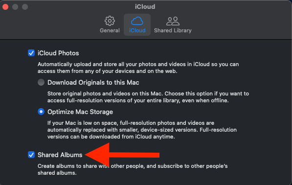 Kun valitset tämän vaihtoehdon, voit synkronoida jaettuja albumeja Macista tai muusta Apple -laitteesta iCloud -tilillesi ja sieltä. Tämän avulla voit jakaa valokuvia helposti perheen ja ystävien kanssa ja tilata muiden ihmisten jaettuja albumeja myös heidän valokuviensa katselemiseksi.