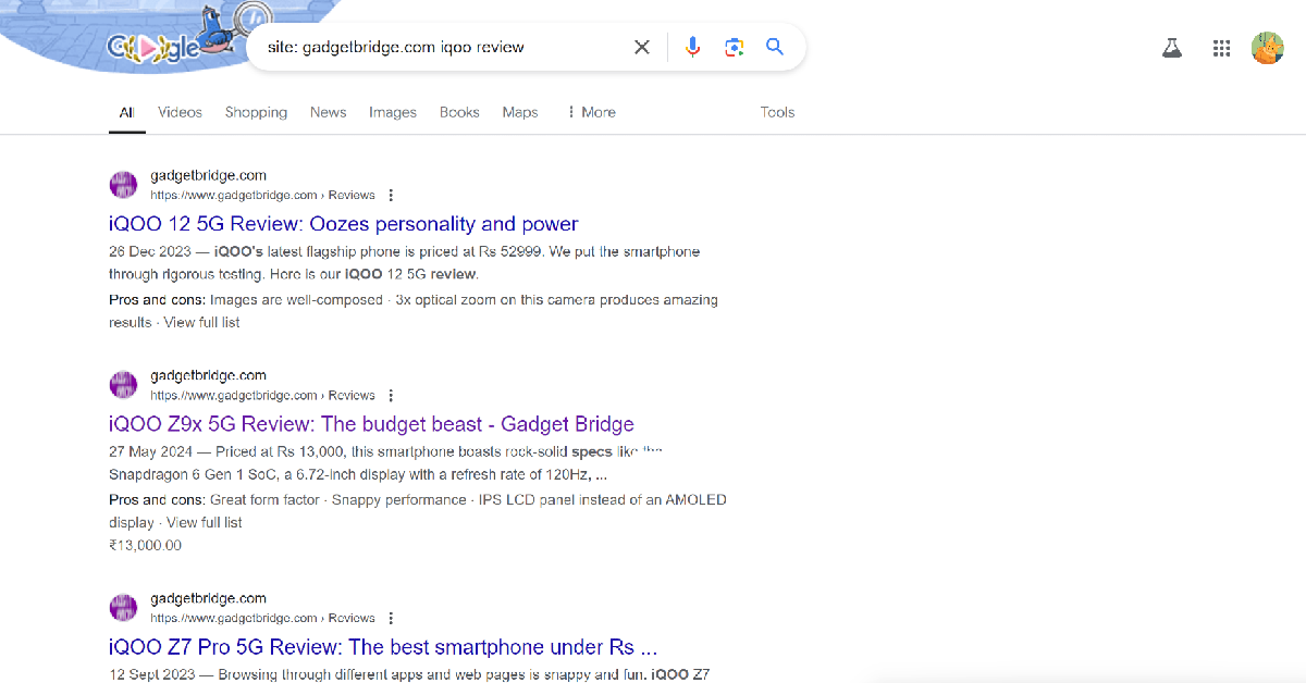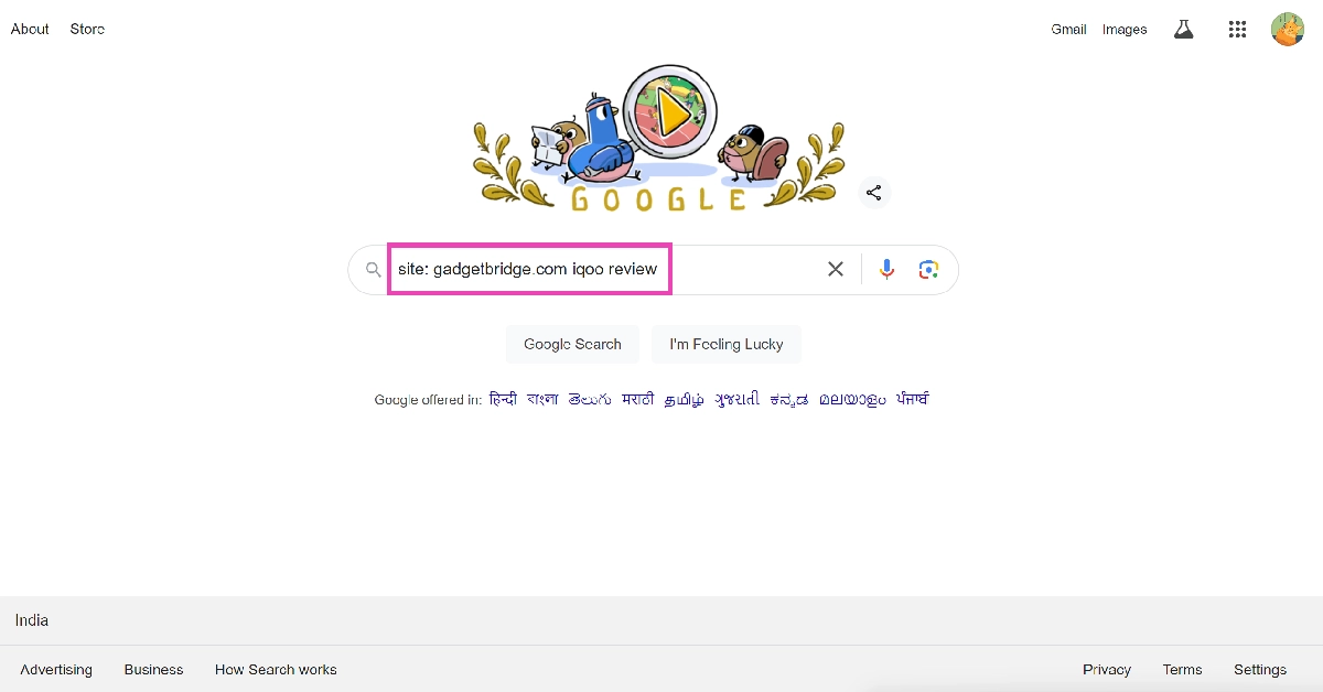 Vaihe 2:Kirjoita omahakukysely. Jos esimerkiksi etsit arvosteluja iQOO-älypuhelimista, kirjoitasivusto: gadgetbridge.com iQOO-arvostelu.