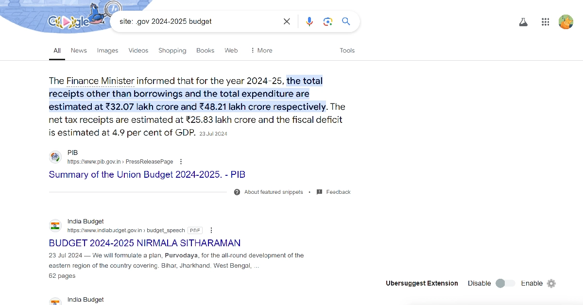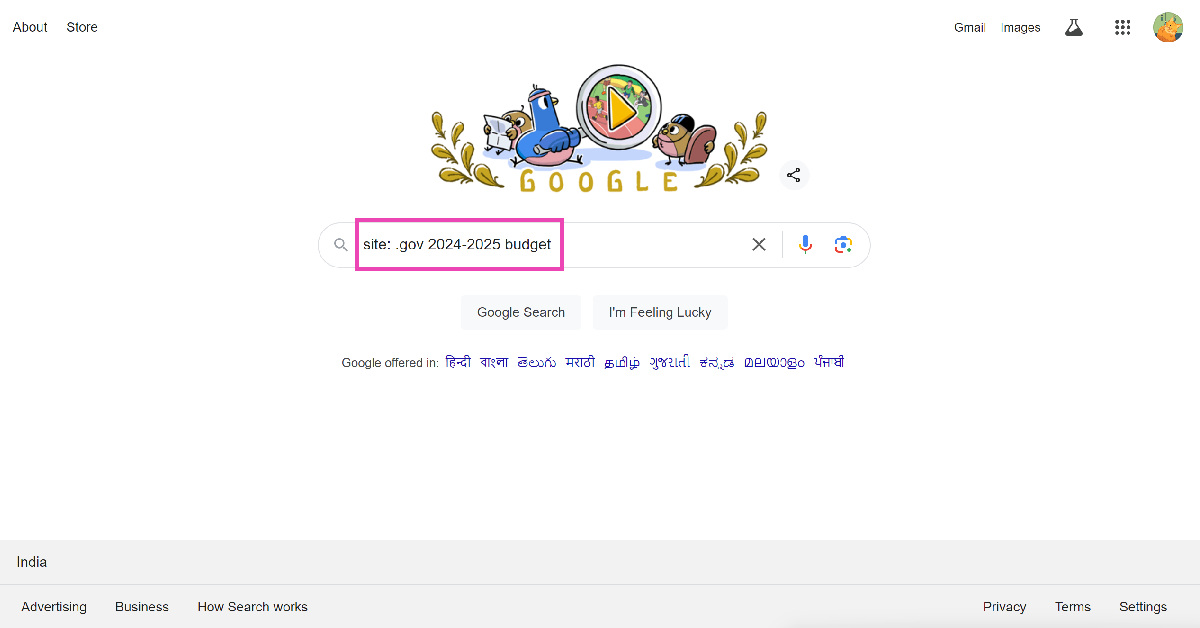Vaihe 2:Kirjoita omahakukysely. Esimerkki: Jos etsit vuosien 2024–2025 budjettiin liittyviä tietoja, kirjoitasivusto: .gov budget 2024-25.