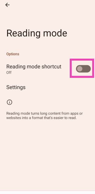 Asenna Googlen Reading Mode -sovellus, käynnistä se, napauta LUEPOLE MODE Kytke päälle vaihtokytkin 'pikakuvake'. Määritä sopiva pikakuvake laukaisevan lukutilan käynnistämiseksi.