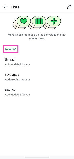 Yksinkertaisesti sanottuna chat-luettelo on suodatin, joka näyttää keskustelut valitusta yhteystietokokoelmasta näytöllä. Voit ryhmitellä yhteystietosi eri luetteloluokkiin ja virittää ne tarvittaessa. Voit esimerkiksi luoda luettelon naapureista, ystävistä, serkuista, työtovereista ja muista. WhatsApp tarjoaa 4 alkuperäistä suodatinta: