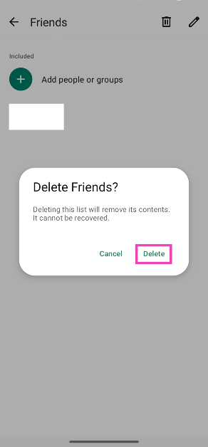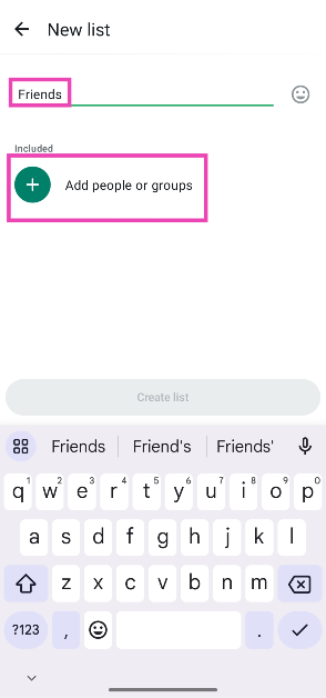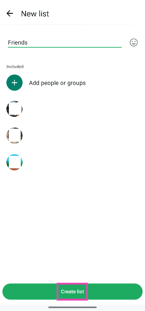 Napauta plus-kuvaketta chat-suodatinrivillä tai valitse Asetukset> Listat> Uusi luettelo luodaksesi keskusteluluettelon. Lisää henkilöitä tai ryhmiä yhteystiedoistasi ja paina Luo.