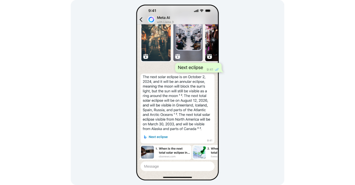 Helppo pääsy Meta AI -chatbotiin WhatsAppissa avaa oven mahdollisuuksien maailmaan. Chatbotin luomistaitojen avulla voit pyytää sitä keksimään vastauksia tekstiviesteihin, sähköposteihin ja strategisiin kysymyksiin. Meta AI voi luoda mitä tahansa runoista vitseihin ja kaikkeen väliin. Voit valita päästä Meta AI: hen missä tahansa WhatsApp -chatissa. Keskustelun osallistujat voivat tarkastella chatbotin vastausta kyselyihisi.