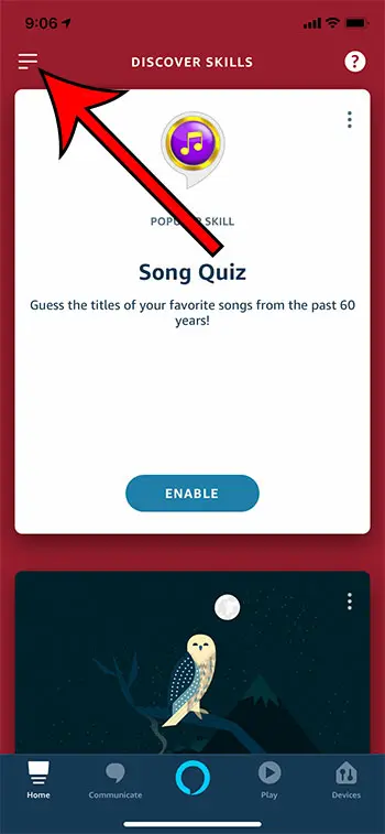 Alexa-sovelluksen uudemmissa versioissa tämä kolmirivinen valikko on sen sijaan näytön oikeassa alakulmassa.