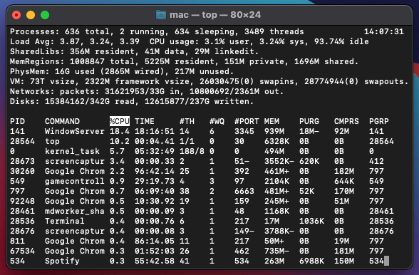 KerranTerminaalion avoin, tyyppi ”ylhäältä”Ja paina Enter. Terminaaliikkuna asuu kaikilla käynnissä olevilla palveluillasi ja prosesseillasi. Kiinnitä erityistä huomiotaPidjokaisesta prosessista. Käytät tätä numeroa tunnistaaksesi, mikä prosessi tappaa.