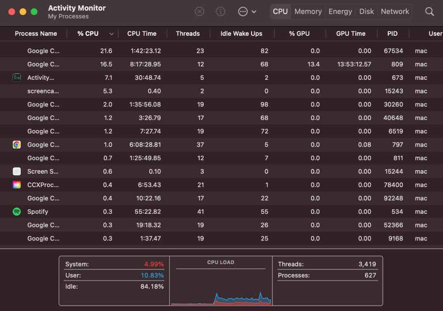 Kun olet avattu, voit nähdä kaikki käynnissä olevat sovellukset ja prosessit Macissa. Nämä lajitellaanSuorittimen-Muisti-Energia-LevyjaVerkko, riippuen siitä, mitä resursseja he käyttävät eniten.