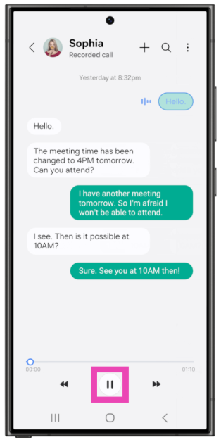 Vaihe 5:Sepuhelun nauhoitusjakopioavataan seuraavalla näytöllä. Transkripteilla on chat -asettelu. Jos et halua kuunnella nauhoitusta, painatauko -painikenäytön alareunassa.