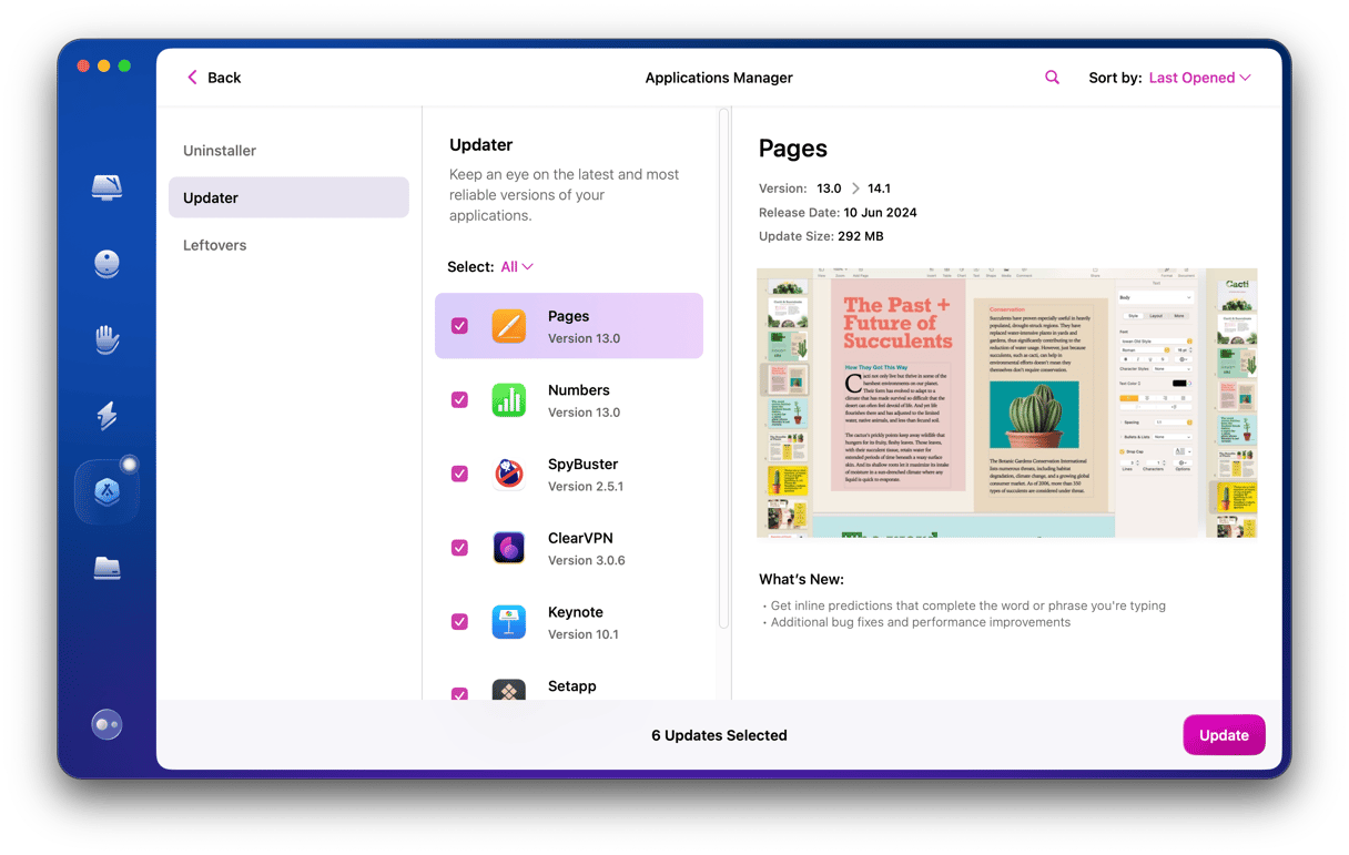 - Varmista, että sovelluksesi ovat ajan tasalla. App Storesta ladattuihin sovelluksiin voit tehdä tämän myymälän päivitysosassa. Muiden sovellusten osalta sovelluksen nimen valikossa on yleensä vaihtoehto tarkistaaksesi päivitykset. (Vinkki: Voit myös käyttää sovellusominaisuutta CleanMymacissa tarkistaaksesi päivitykset ja päivittää kaikki sovelluksesi)