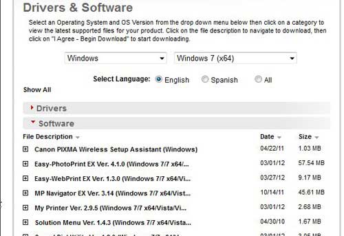 Napsauta avattavaa valikkoa kohdassaAjurit ja ohjelmistotjakso, jossa lukeeValitse Käyttöjärjestelmäja napsauta sittenValitse käyttöjärjestelmäversioavattavasta valikosta ja valitse tietokoneellesi asennetun käyttöjärjestelmän versio. Alla olevassa kuvassa olen valinnutWindowsjaWindows 7 (x64),vastaavasti. Sitten sinun on napsautettava harmaataOhjelmistolinkki, sittenMP Navigator EX Ver. 3.14linkki.