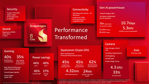 Snapdragon 8 Elite tarjoaa useita parannuksia edeltäjäänsä verrattuna, mukaan lukien parannettu suorittimen ja grafiikkasuorittimen suorituskyky, parannettu virrankulutus ja edistyneet AI-ominaisuudet. Näiden päivitysten odotetaan johtavan tasaisempaan käyttökokemukseen, pidempään akun kestoon ja parannetuiksi kameraominaisuuksiksi Galaxy S25 -sarjassa.