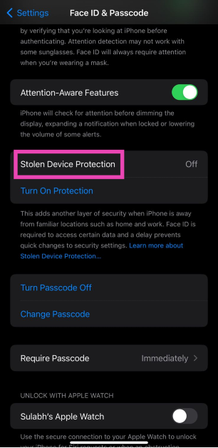 Kun se on kytketty päälle, varastetut laitteen suojausvaatimukset vaativat kasvotunnusta tai kosketustunnusta ominaisuuksien, kuten avainnipun, maksujen, Apple -lompakon, kadonneen tilan ja paljon muuta. Se estää myös henkilöä, joka on varastanut iPhonesi tekemästä muutoksia laitteen asetuksiin heti.