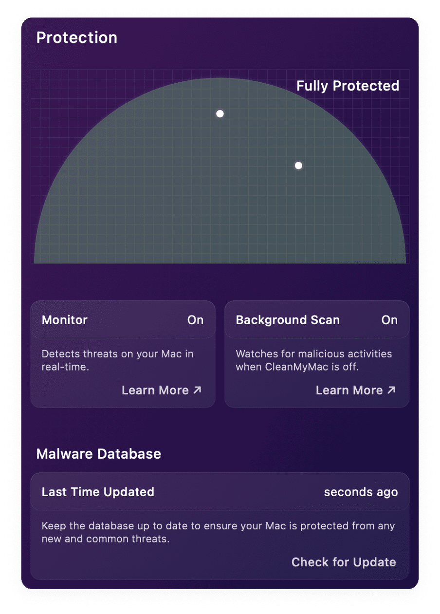 Malware-työkalun käyttäminen on paras tapa skannata Mac-matoja. Pidän parempana CleanMymacia, koska siinä on valtava haittaohjelmatietokanta, joka päivitetään säännöllisesti. Jos otat taustaskannauksen käyttöön, voit olla varma, että mikään matovirus tai muut haittaohjelmat eivät hiipi Maciin. Näin se asetetaan: