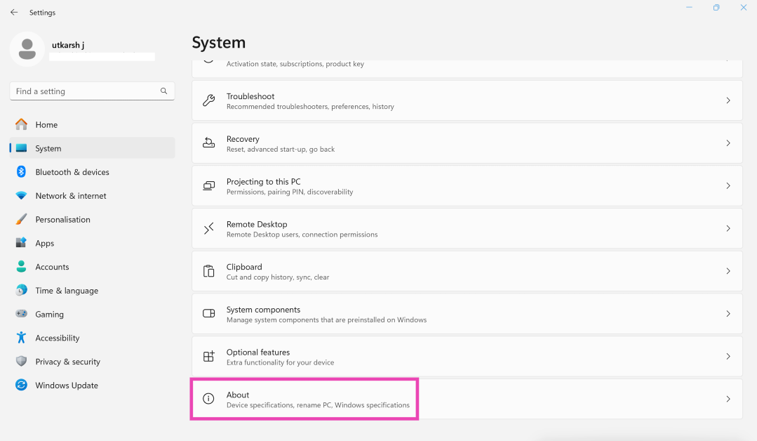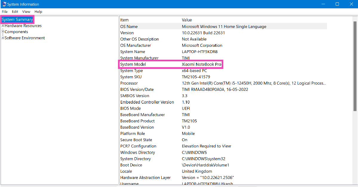 Löydä 'järjestelmätiedot' hakupalkki ja siirry järjestelmätietoihin ja siirry järjestelmän yhteenveto -välilehteen saadaksesi selville, mitä kannettava tietokonetta kutsutaan.