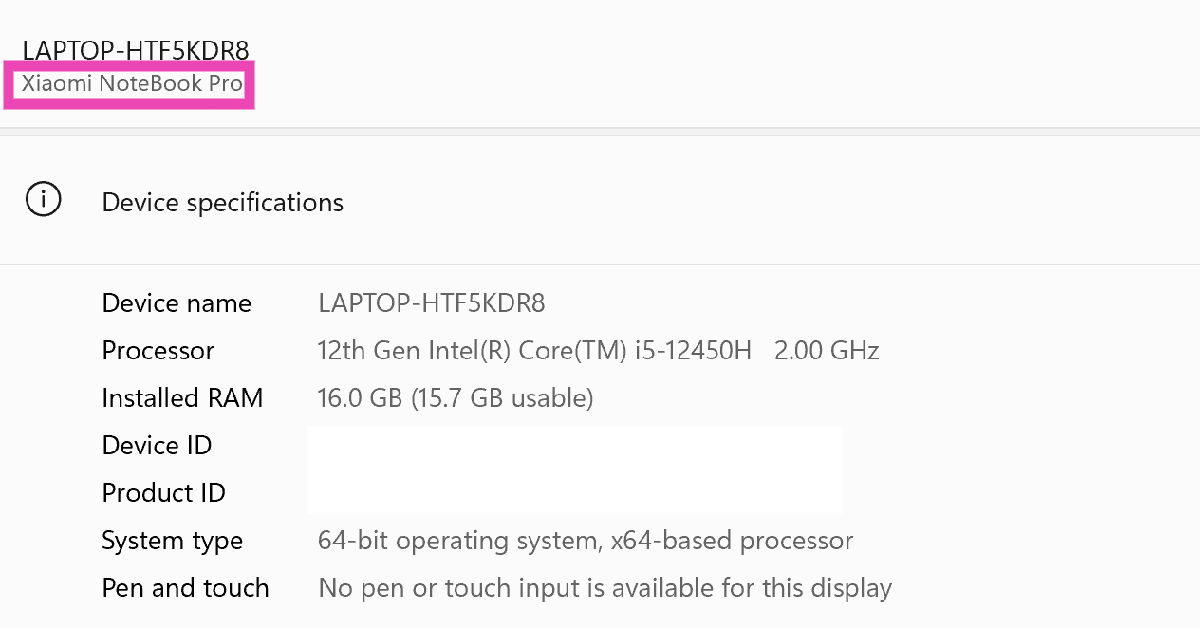 Vaihe 3:Kannettavan tietokoneen mallin nimi/numero luetellaanJärjestelmämalliluokka.
