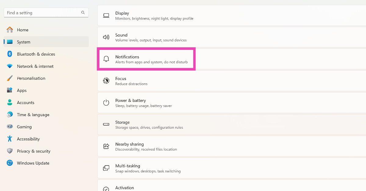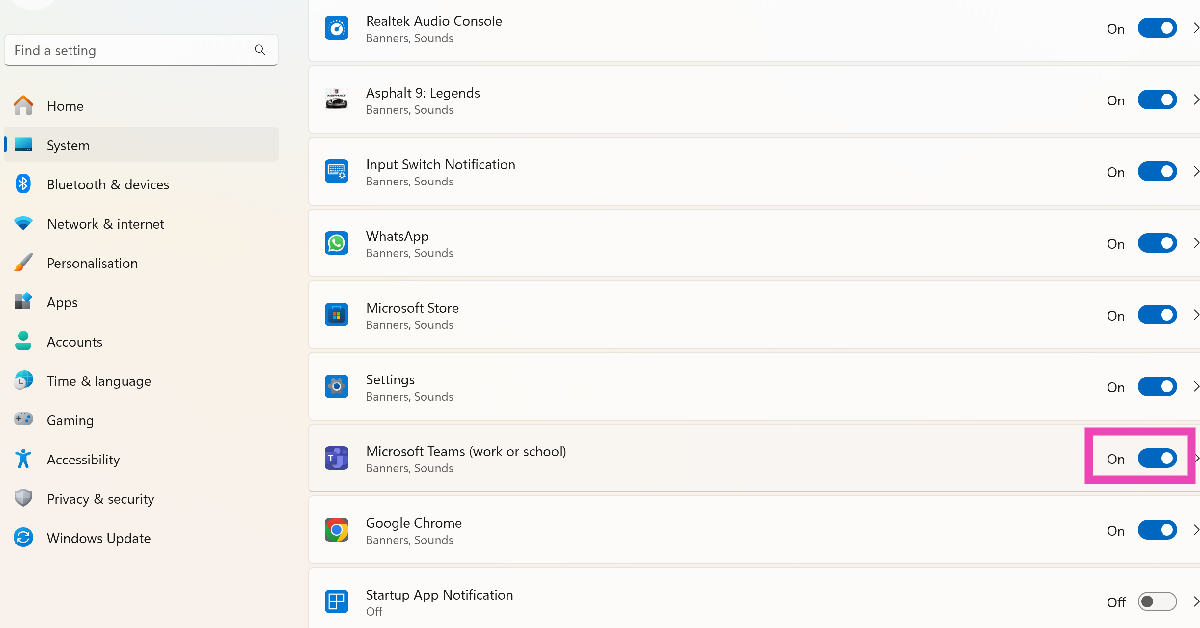 Siirry osoitteeseenAsetukset> Järjestelmä> Ilmoituksetja laita Microsoft Teamsin vieressä oleva vaihtokytkin päälle.