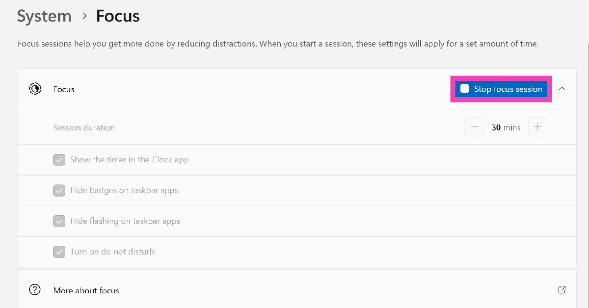 Kun aloitat Focus-istunnon Windows-tietokoneella tai kannettavalla tietokoneella, kaikki ilmoitushälytykset keskeytetään, kunnes istunto kestää. Näin voit sammuttaa sen.