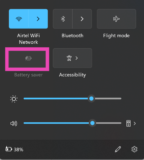 Kun tietokoneesi tai kannettavan tietokoneen akun varaustaso on alhainen, se käynnistää virransäästön. Virransäästötilassa kaikki tietokoneellesi lähetettävät ilmoitushälytykset keskeytetään. Voit kytkeä akunsäästön pois päältä, vaikka tietokoneesi lataus olisi vähissä. Napsauta tehtäväpalkin oikeassa alakulmassa olevaa akkukuvaketta ja sammuta se napsauttamalla akunsäästöpainiketta. Voit myös mennä osoitteeseenAsetukset> Järjestelmä> Virta ja akkukytkeäksesi virransäästön pois päältä.
