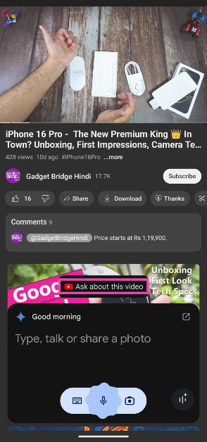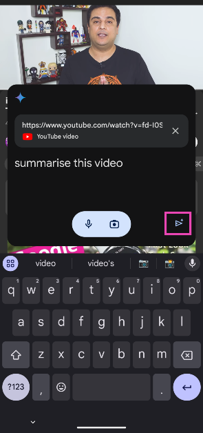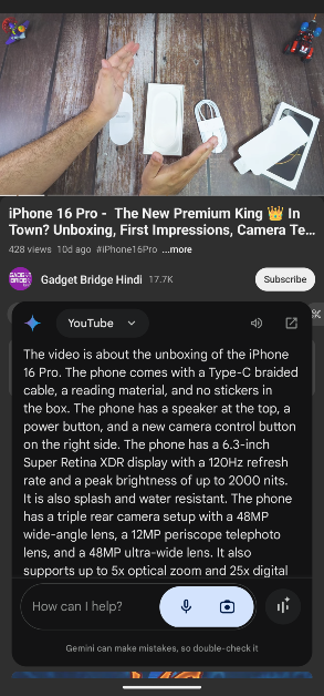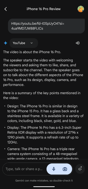 Voit tehdä yhteenvedon videoista Geminin YouTube-laajennuksella. Chatbot voi myös vastata kaikkiin videoon liittyviin kysymyksiin.