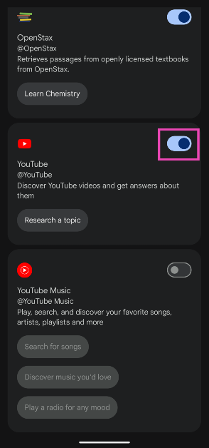 Gemini on enemmän kuin pelkkä tekoäly-chatbot puhelimellesi. Sen laajennukset voivat olla vuorovaikutuksessa tiettyjen puhelimesi sovellusten kanssa ja hoitaa monenlaisia tehtäviä. Tällä hetkellä Gemini-laajennukset ovat saatavilla vain Googlen palveluihin. Näitä ovat Google Flights, Google Hotels, Google Maps, Google Workspace (Gmail, Drive, Docs ja paljon muuta), OpenStax, YouTube ja YouTube Music.