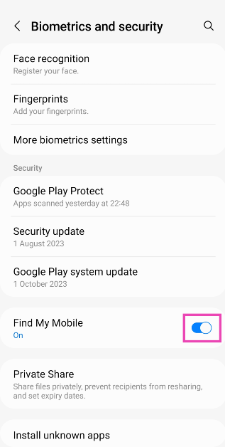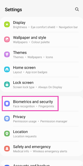 Vaihe 1:Mennä jhkAsetuksetja valitseBiometriset tiedot ja turvallisuus.