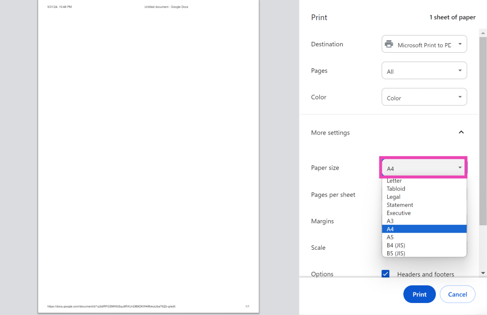 Napsauta Print Preview -ikkunassa lisää asetuksia, paina sitten 'paperikoko' ja valitse haluamasi koko.