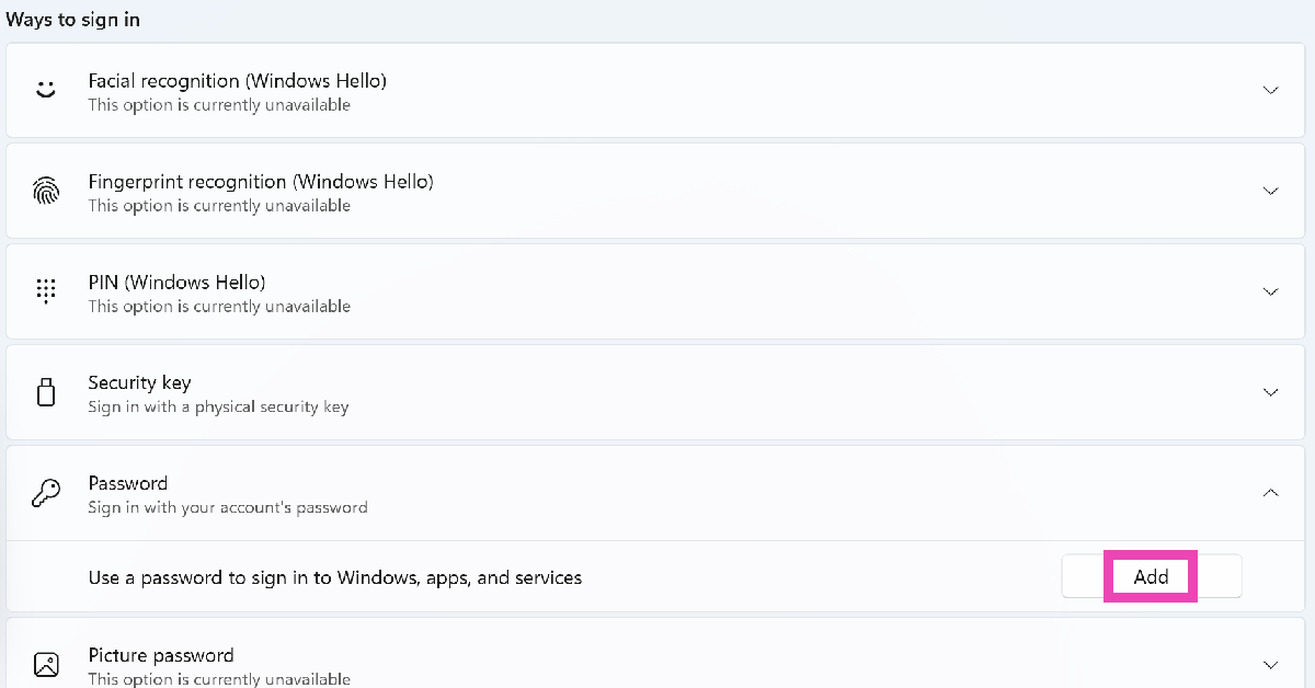 Mennä jhkAsetukset> Tilit> Kirjautumisvaihtoehdot> Salasana> Lisää. Kirjoita vanha salasanasi, jota seuraa salasana, jonka haluat luoda laitteellesi. Vahvista salasanasi seuraavassa tekstikenttään ja paina 'viimeistely'.