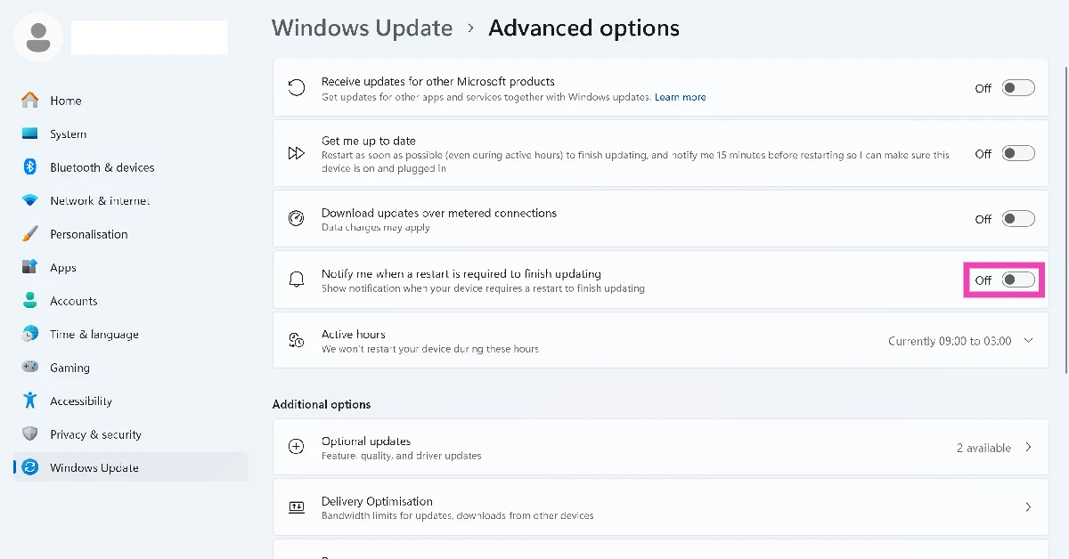 Siirry osoitteeseenAsetukset> Windows Update> Lisäasetuksetja sammuta vaihtokytkin "Ilmoita minulle, kun päivityksen lopettaminen edellyttää uudelleenkäynnistystä" -kohdan vieressä.