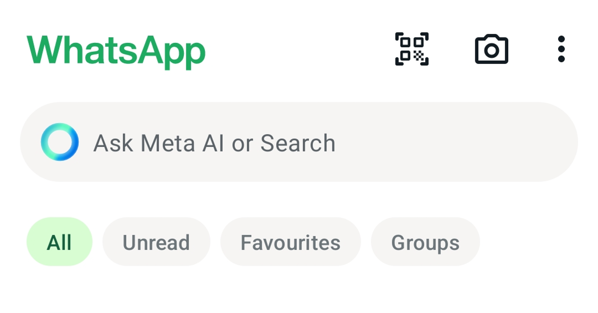 WhatsAppin ensimmäinen välilehti on omistettu keskusteluille. Kolme muuta välilehteä ovat päivityksiä, yhteisöjä ja puheluita varten.