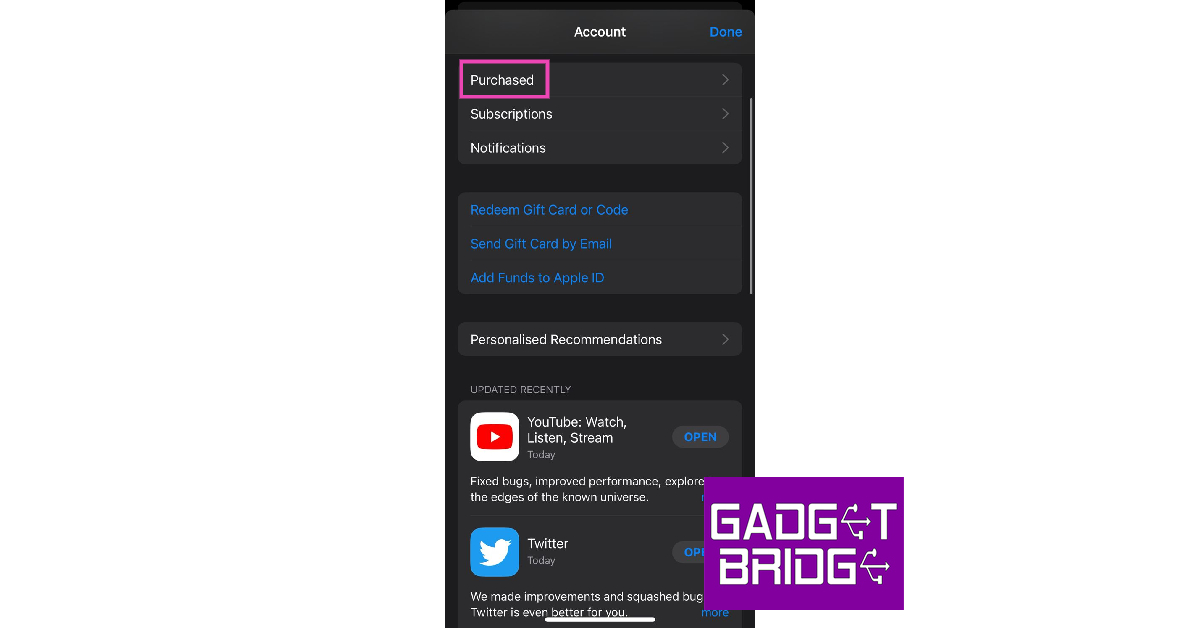 Vaihe 3:Valitse ostettu. Jos olet ottanut perheen jakamisen käyttöön, valitse ostot.