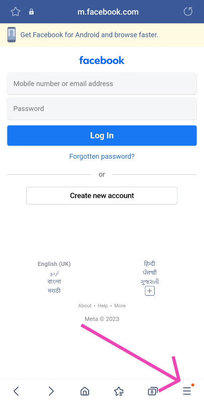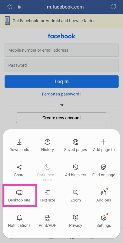 Avaa Facebook Desktop -sivusto alkuperäiskansojen Android -selaimella