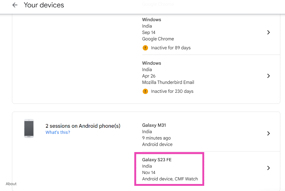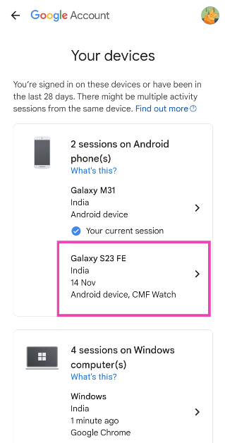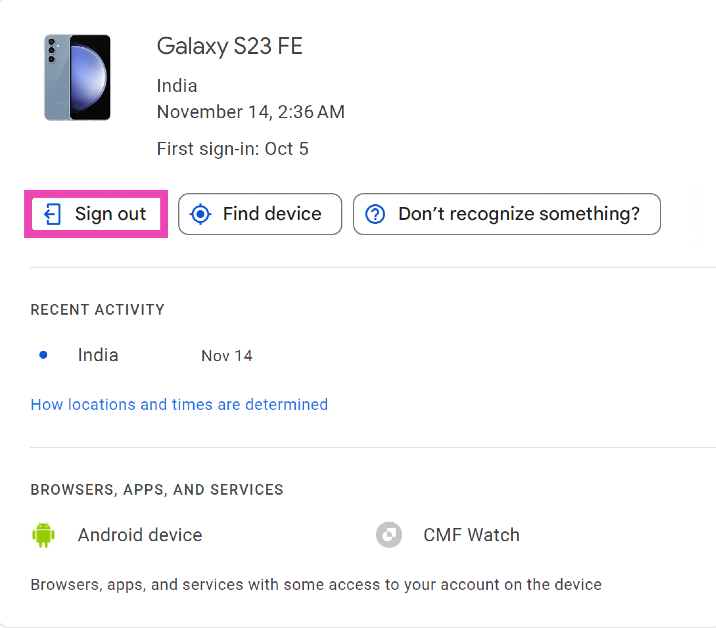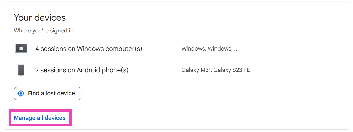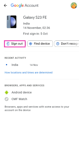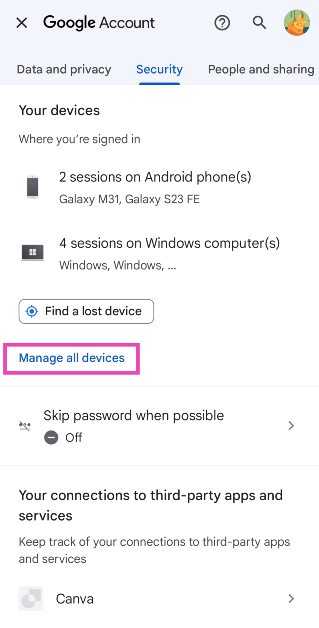 Jos puhelimesi varastetaan, kirjaudu Google-tilillesi tietokoneellasi, napsauta profiilikuvaasi ja valitseHallinnoi Google-tiliäsi. Siirry sitten kohtaanSuojaus> Hallitse kaikkia laitteitaja kirjaudu ulos Android-puhelimestasi.