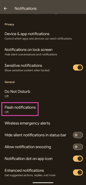 Vaihe 2:Vieritä alas ja valitseFlash -ilmoitukset.