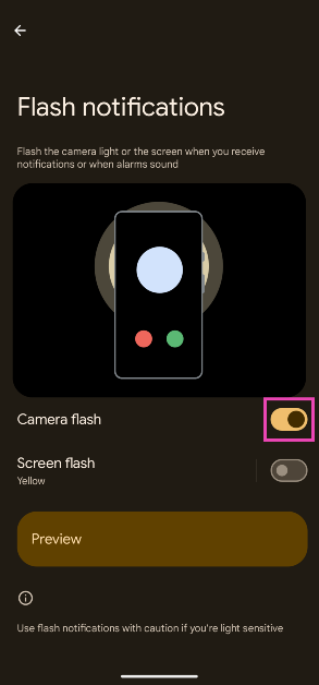 Mennä jhkAsetukset> Saavutettavuus> Lisäasetukset> Flash -ilmoitusja kytke kytkentäpalkki päälle kameran flash -ilmoitukselle.