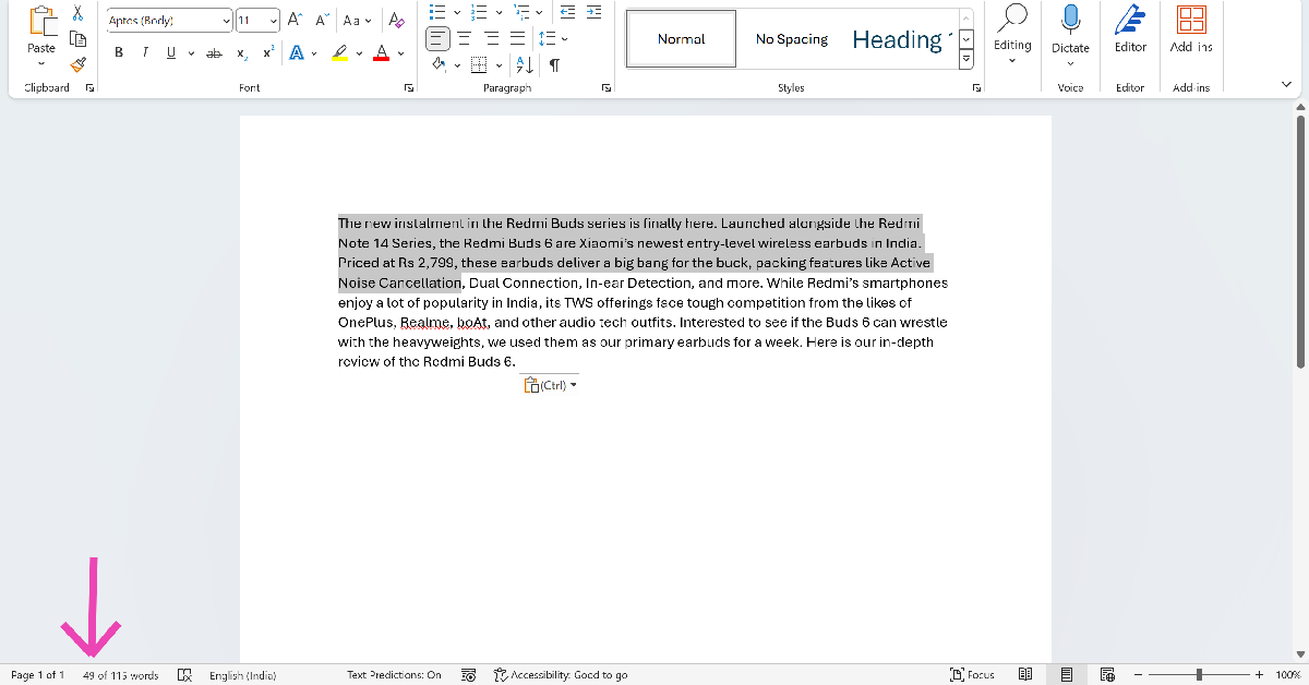 Jos haluat tietää tietyn rivin tai kappaleen sanamäärän, korosta se vain näppäimistöllä tai hiirellä ja tarkista laskuri näytön alaosassa. Sanalaskuri näyttää valittujen sanojen lukumäärän ja sanojen kokonaismäärän. Tämä temppu auttaa, kun haluat leikata vain tietyn osan tekstistä.