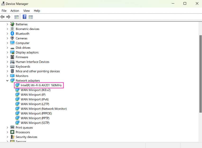 Vaihe 5:Tarkista, että oikea WiFi-ohjain on asennettu menemällä osoitteeseenLaitehallintaja tarkastella langattoman sovittimen ominaisuuksia.