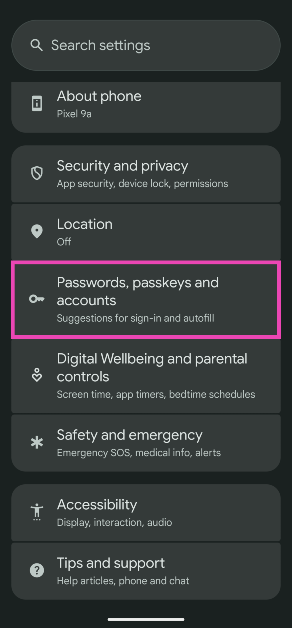 Vaihe 1:Siirry osoitteeseenAsetuksetja napautaSalasanat, salasanat ja tilit.